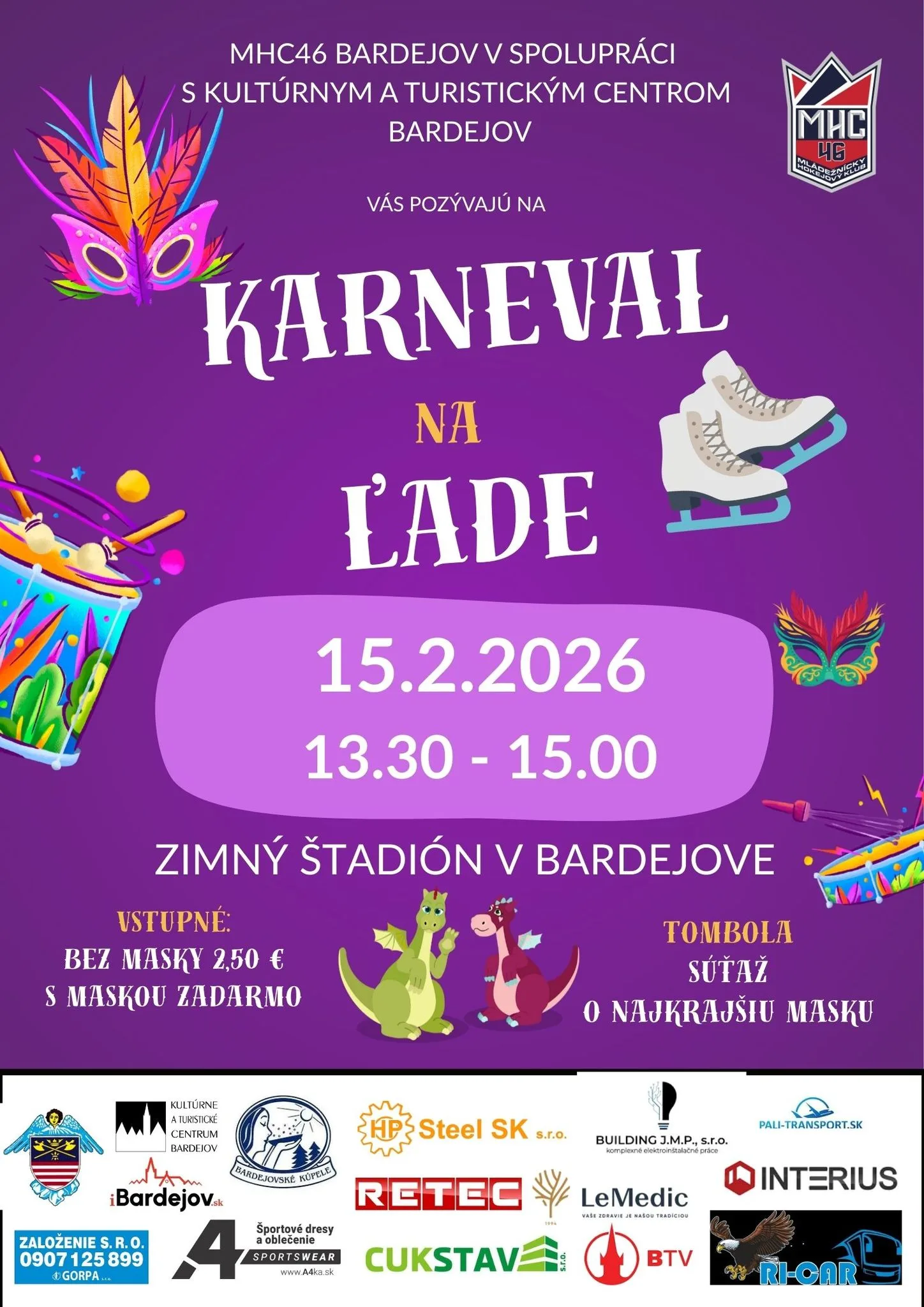 V nedeľu 15. 2. 2026 vás všetkých pozývame na super Karneval na ľade. V týchto posledných fašiangových dňoch ho pre vás na ľadovej ploche Zimného štadióna v Bardejove pripravujú hokejisti Mládež HC 46 Bardejov spolu s dráčikom Ohniváčikom, Dračicou Plamienkou a ich tímom z Kultúrno-turistického centra v Bardejove. Karneval sa uskutoční v čase od 13.30 – 15.00 hod. . Každá maska má vstup na podujatie zdarma. Vstupné bez masky je 2,5 Eur. Pre všetkých je pripravená super zábava, korčuľovanie, tombola a súťaž o najkrajšiu masku.